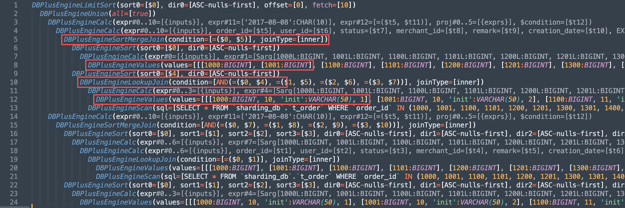 我们通过 EXPLAIN 语句观察这条 SQL 的执行计划,可以看到和用户反馈 SQL 的执行计划类似,2 个 IN 过滤条件依次被转换为 DBPlusEngineLookupJoin 和 DBPlusEngineSortMergeJoin,这些 JOIN 通过关联 DBPlusEngineValues 中的常量列表来实现数据过滤。此外,DBPlusEngineScan 算子中的下推 SQL,只包含了单列 IN 过滤条件,没有包含多列 IN 过滤条件,这会导致查询到内存的数据量比预期要大,通过内存过滤多列 IN,查询的性能要差很多。