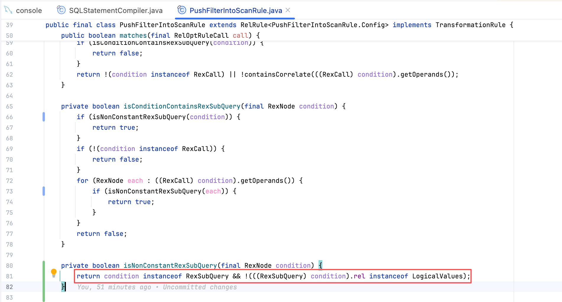 研究清楚问题的根本原因后,我们的目标就很明确了——重写 SubQueryRemoveRule 规则,IN 常量集合子查询不改写为 JOIN,保留原始的 Filter,并将 Filter 下推到 DBPlusEngineScan 中。