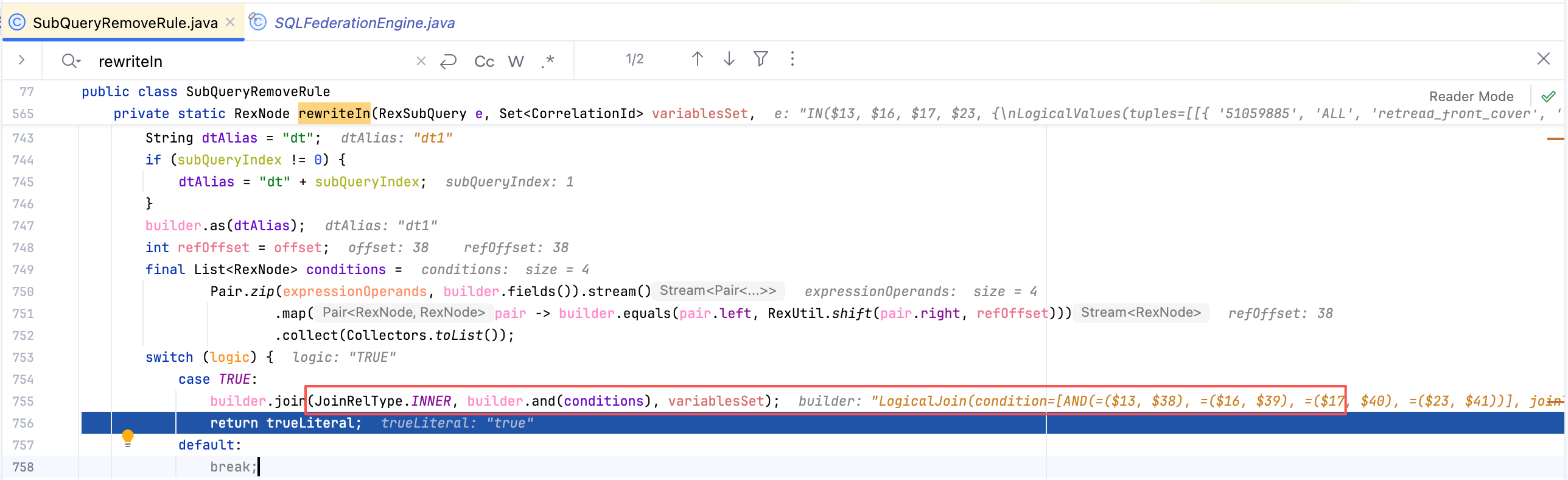 现在我们已经将问题的范围缩小到 RBO 优化过程,但是 RBO 优化使用的优化规则很多,具体是哪一个优化规则导致的呢?我们首先来 Debug,观察原始逻辑执行计划生成的过程,了解 IN 算子在 RelNode 中是如何表示的,再根据 RelNode 去排查优化规则。